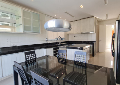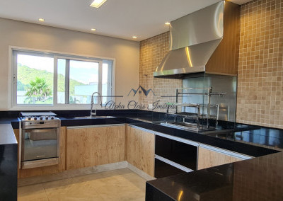 Copa-cozinha completa com ilha, armários planejados e eletrodomésticos