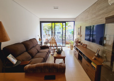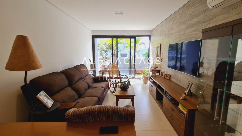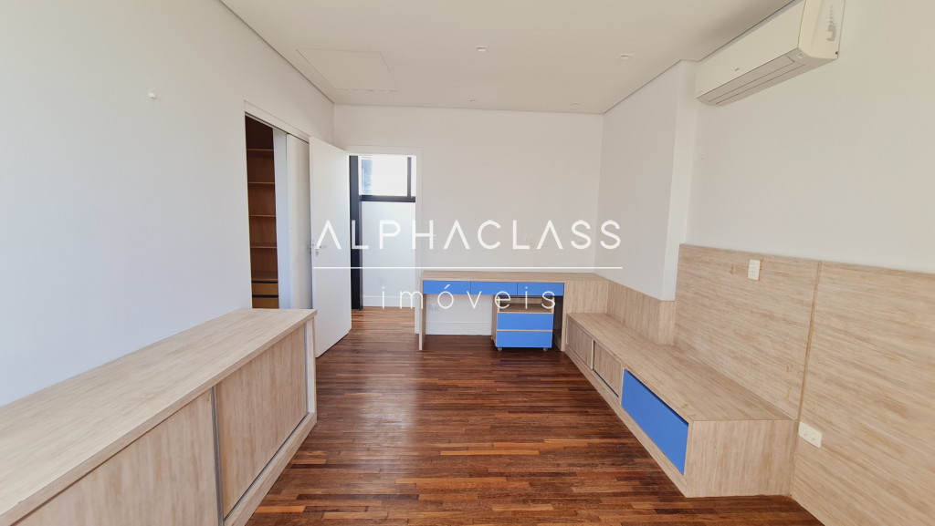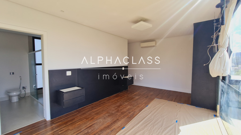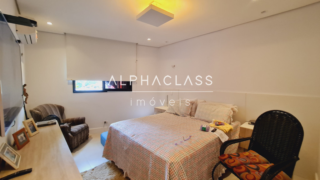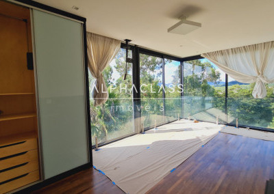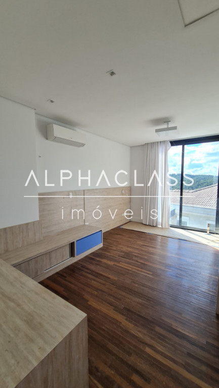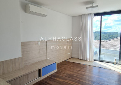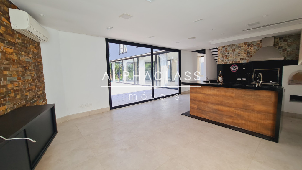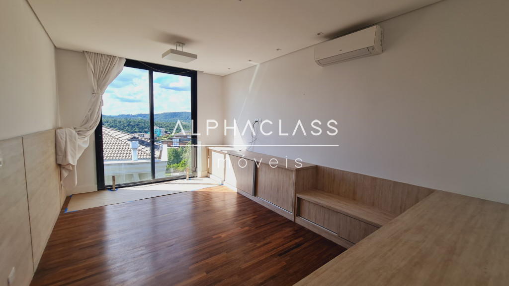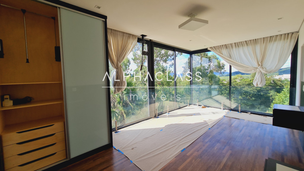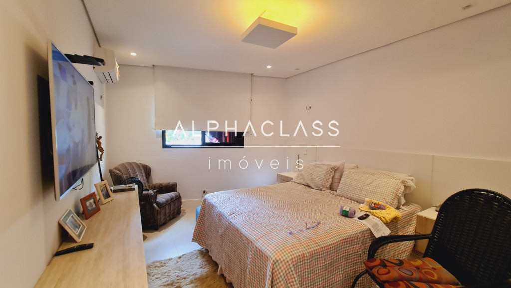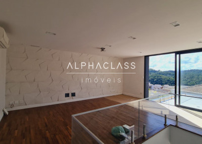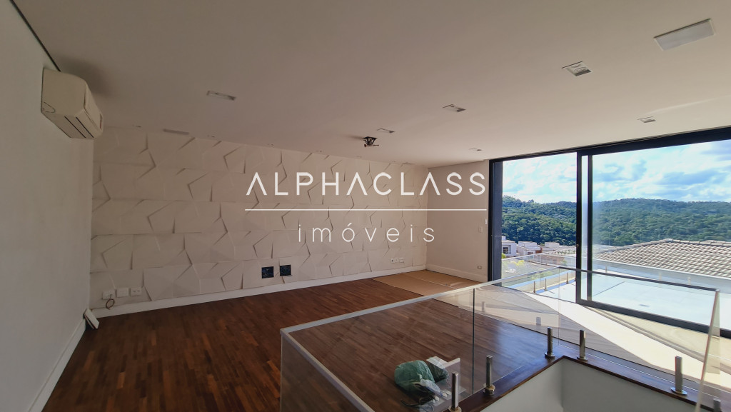 No andar superior, são 3 suítes com ar-condicionado e closet, além de um home theater equipado com parede para tela retrátil, som estéreo e ar-condicionado. O piso de madeira reforça o charme dos ambientes, que ainda contam com um pátio externo ajardinado e vista privilegiada para frente da casa e área de lazer.