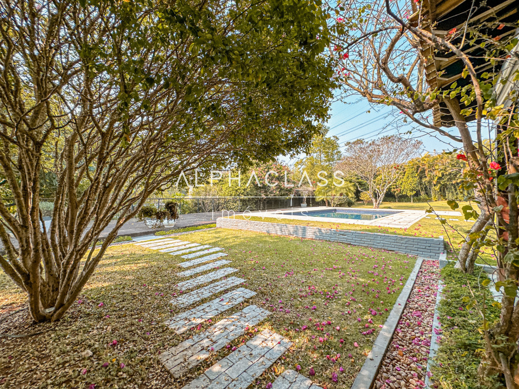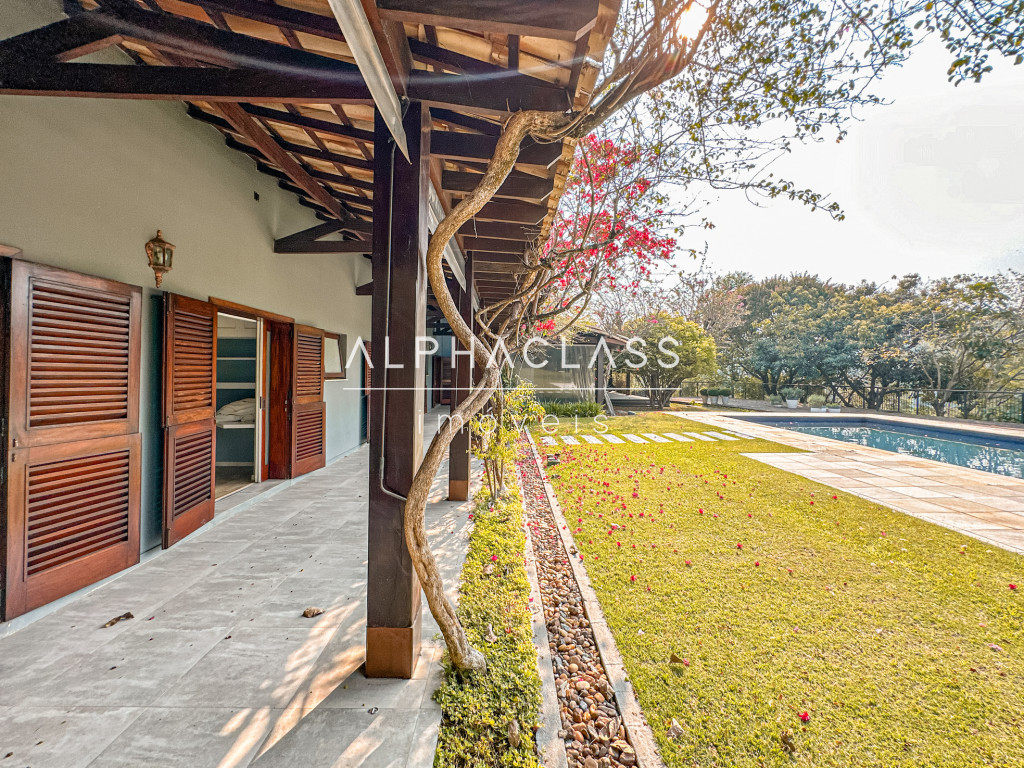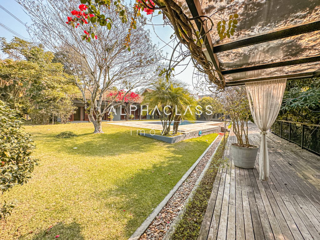 A ampla varanda que contorna quartos, sala e cozinha cria uma atmosfera acolhedora e convida a momentos de relaxamento e convivência. O jardim é protagonista, com paisagismo encantador, pomar formado e uma piscina rodeada por deck de madeira, compondo um cenário perfeito para lazer e contemplação.