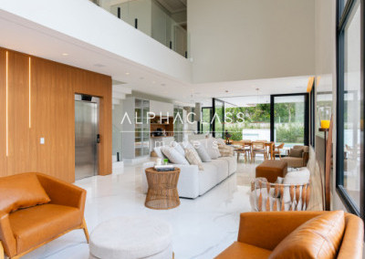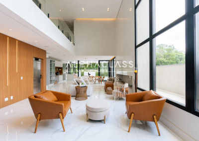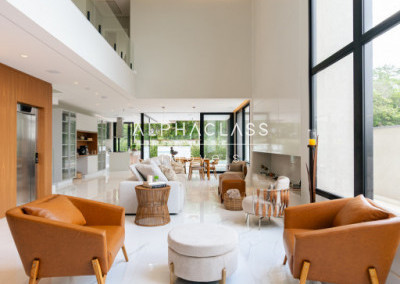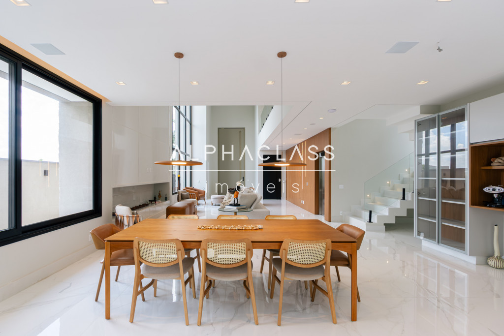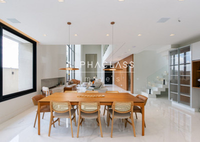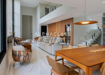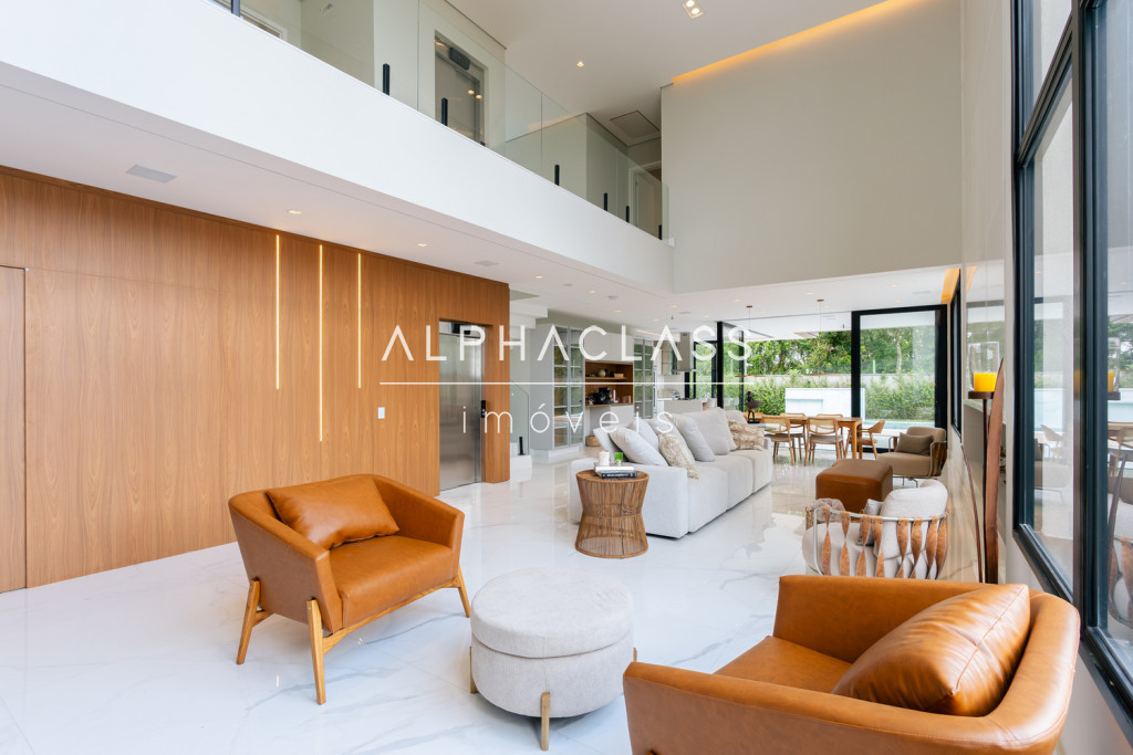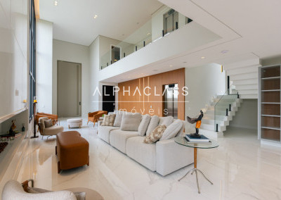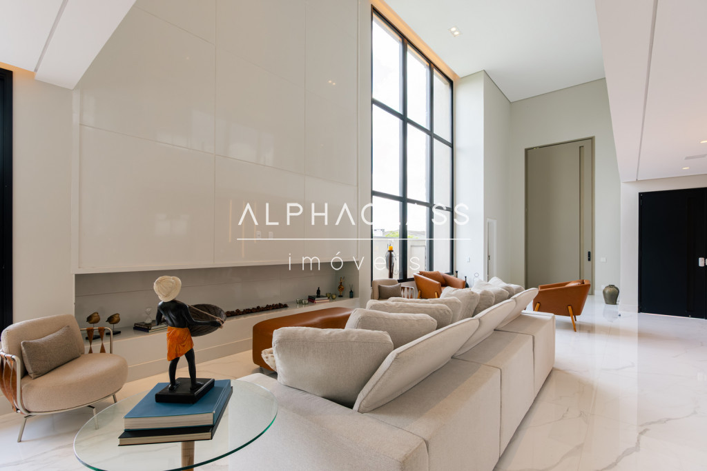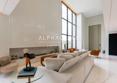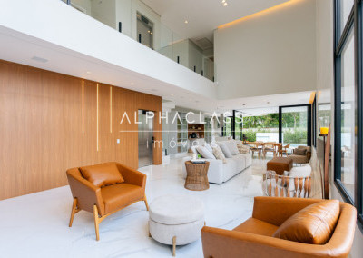 Logo ao entrar, você é recebido por uma porta imponente de 5 metros, que se abre para um amplo living com pé-direito duplo, banhado em luz natural, proporcionando uma sensação de espaço e liberdade incomparáveis. A lareira traz aconchego e elegância aos momentos em família e entre amigos.
