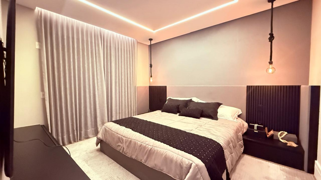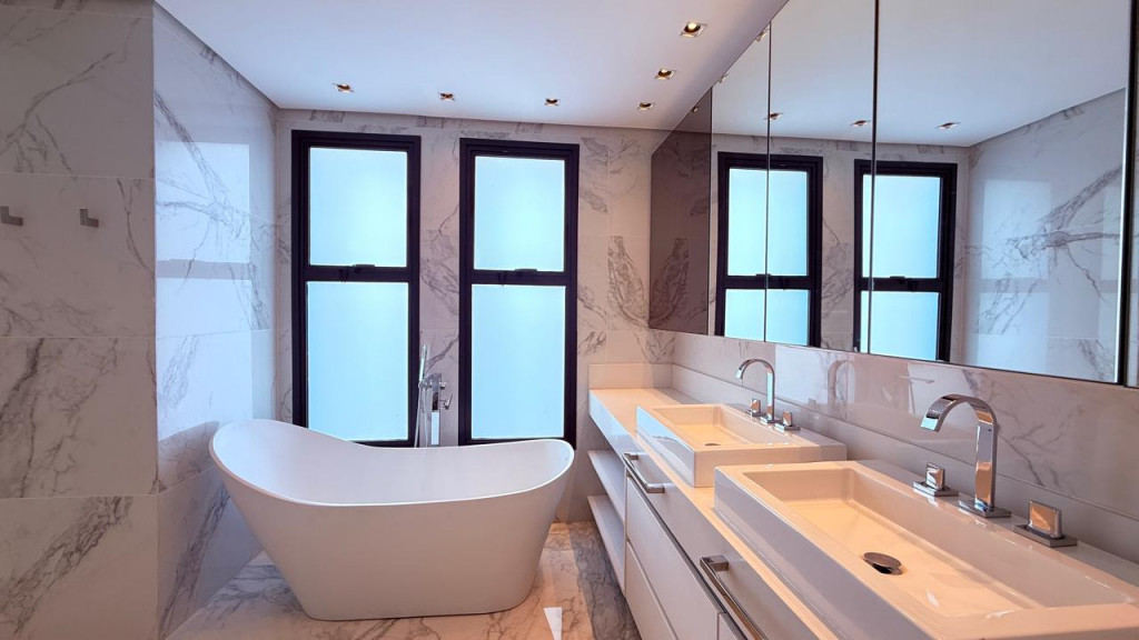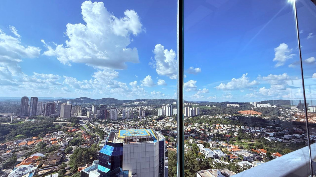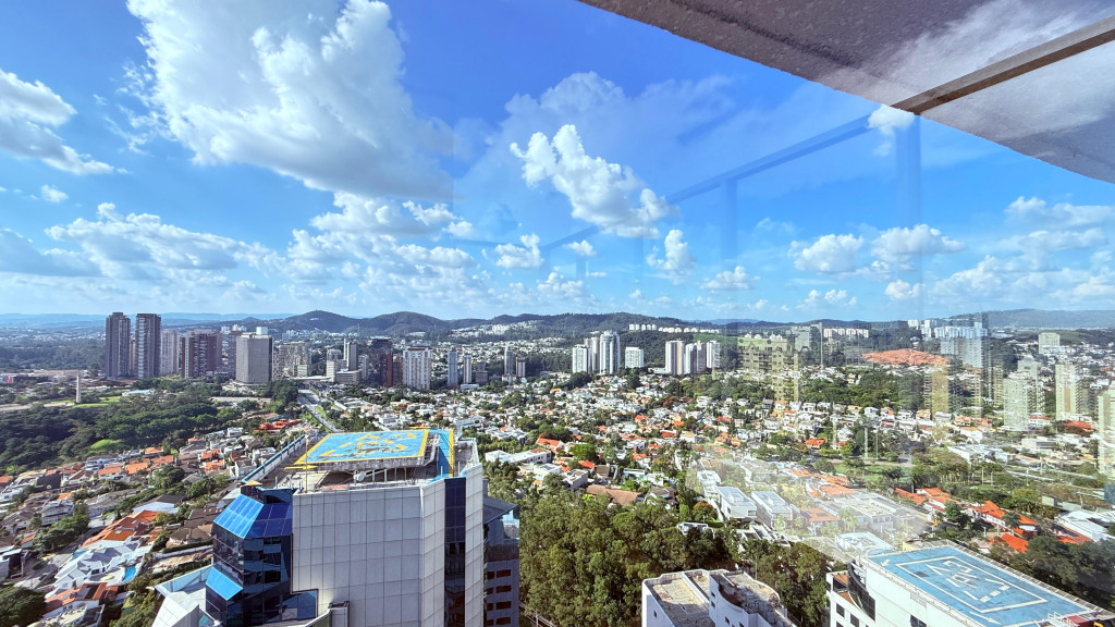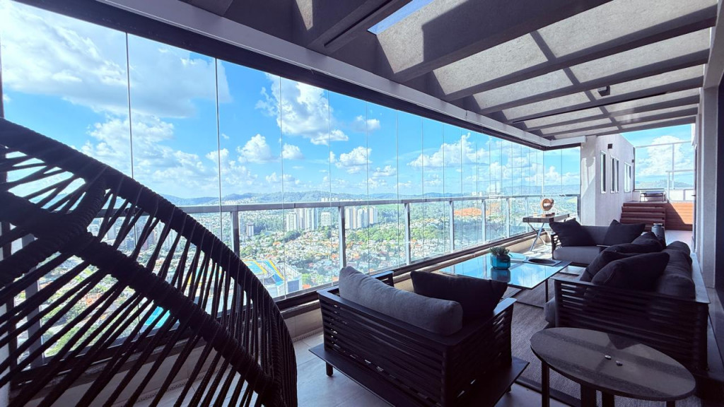 Conta com quatro suítes, incluindo suíte master, home theater, varanda dupla com vista panorâmica, espaço gourmet, ofurô com deck, solarium e cinco vagas de garagem.
