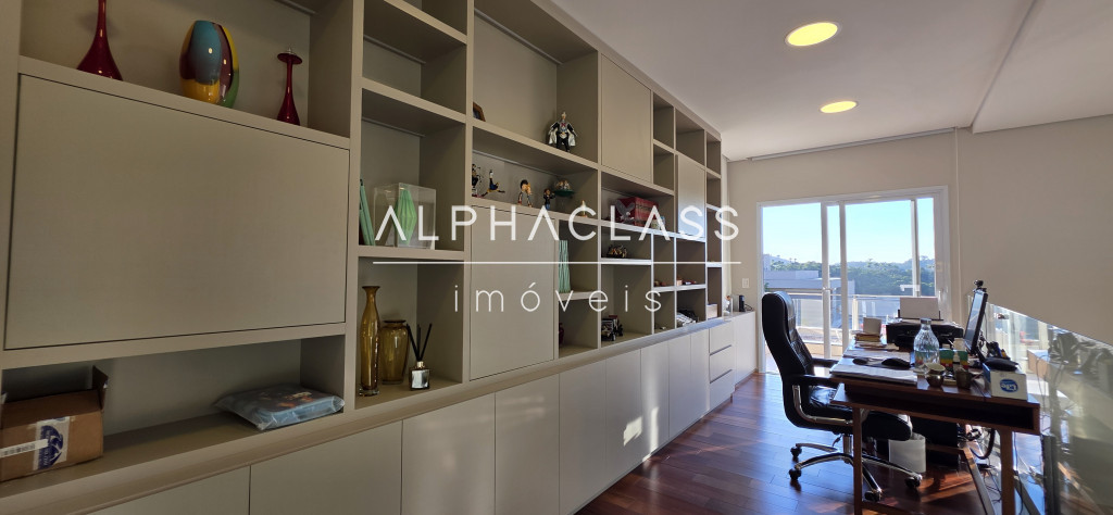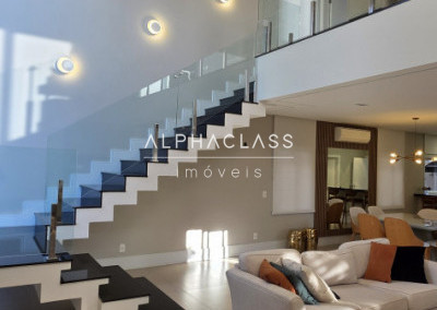 No pavimento superior, são 3 suítes, sendo a máster com hidromassagem e varanda ampla, além de um mezanino com escritório e acesso a uma espaçosa varanda.