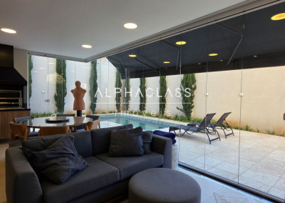 No pavimento térreo, conta com garagem para 6 veículos (2 cobertos), depósito externo, suíte de serviço, piscina, banheiro e ducha de apoio, cisterna para captação de água pluvial, casa de máquinas e acesso lateral para a lavanderia. O hall social com pé direito duplo dá as boas-vindas, seguido por lavabo, cozinha completa em conceito aberto, sala de estar, sala de jantar e ampla área gourmet com churrasqueira, fechamento envidraçado e vista para a piscina.