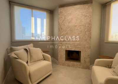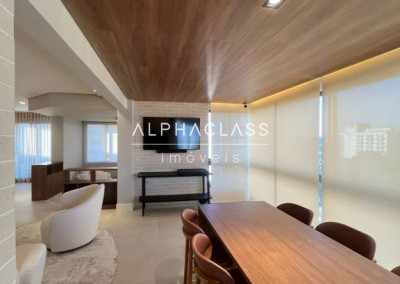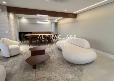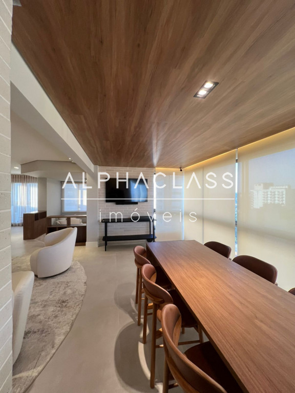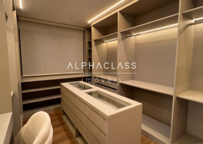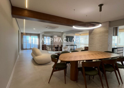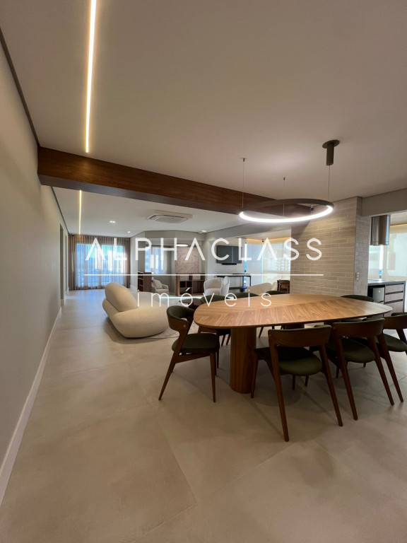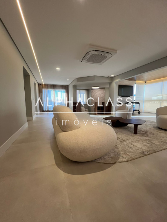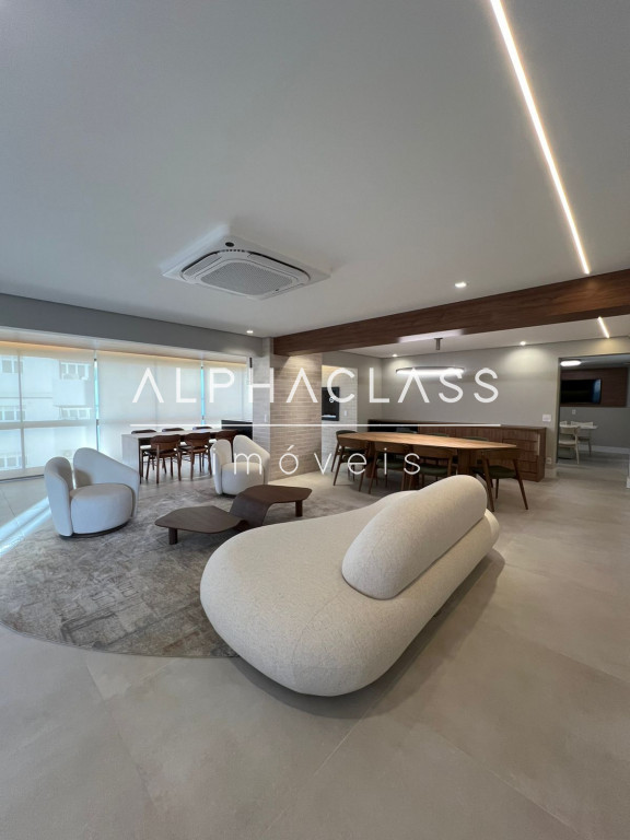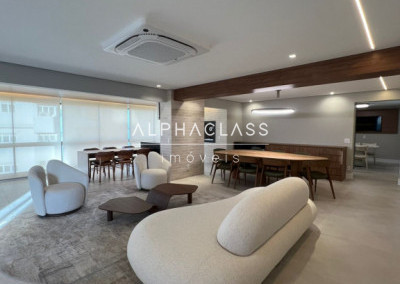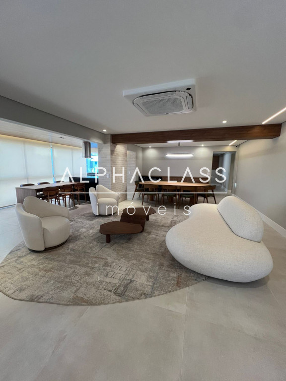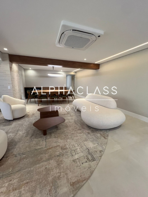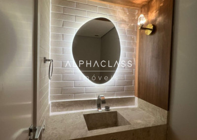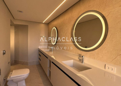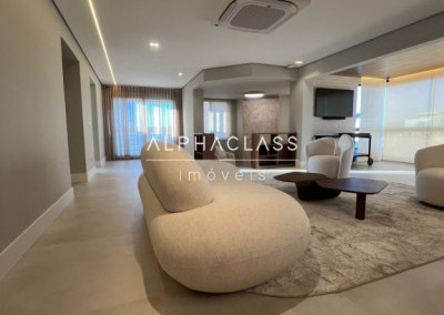 São 5 banheiros no total e 4 vagas de garagem, além de depósito. O apartamento está mobiliado com peças da loja Mix Conceito, marcenaria completa, iluminação projetada e ar-condicionado quente e frio com conectividade Wi-Fi em todos os ambientes. Conta com sistema Alexa, câmeras, aspiração central, rede Wi-Fi distribuída por 4 roteadores, e tomadas USB nas suítes.