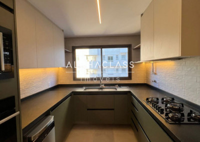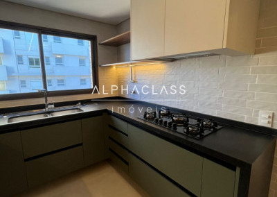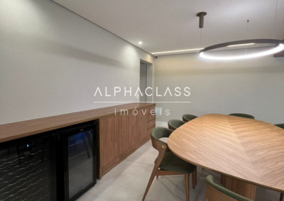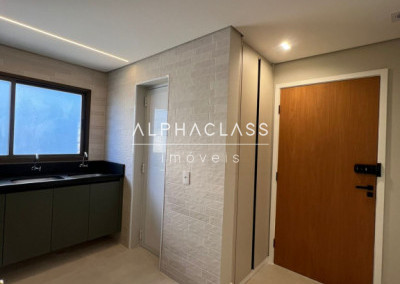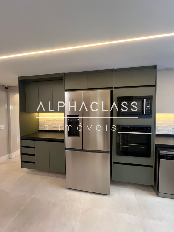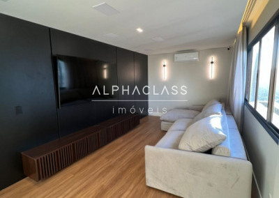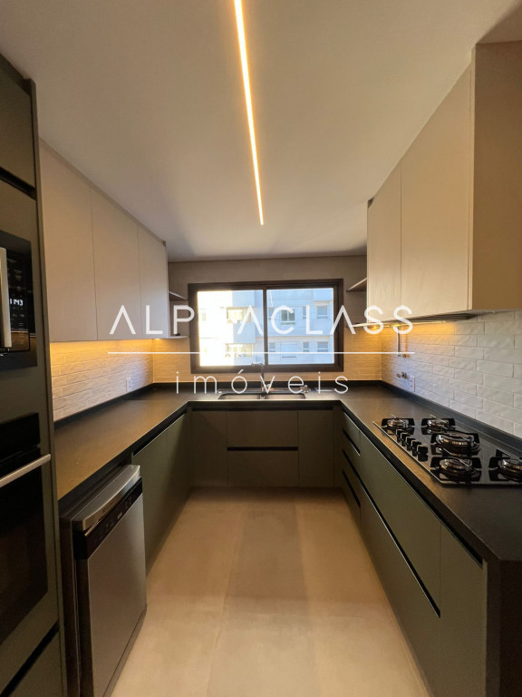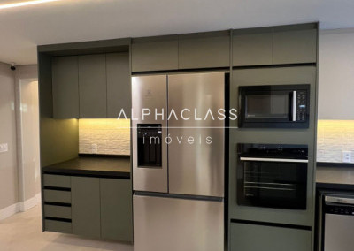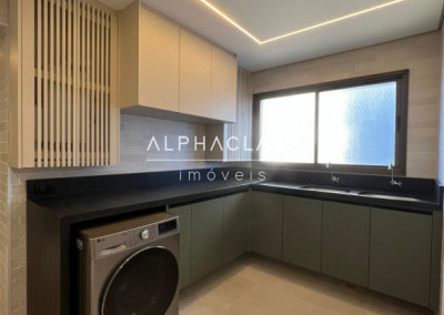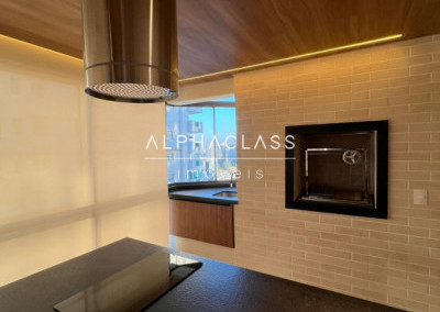 A cozinha está equipada com geladeira side by side, cooktop, coifa, forno e micro-ondas embutidos, lava-louças, filtro de água e triturador, todos com garantia estendida. Na lavanderia, máquina lava e seca de 12 kg. A área gourmet possui churrasqueira, adega, cervejeira, frigobar, cooktop e coifa, além de TV’s no home theater, área gourmet e cozinha.