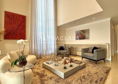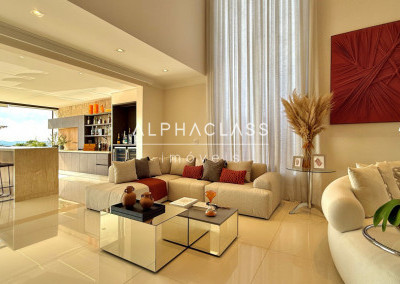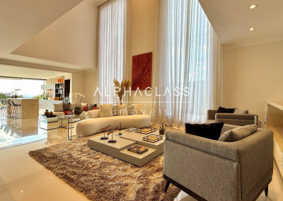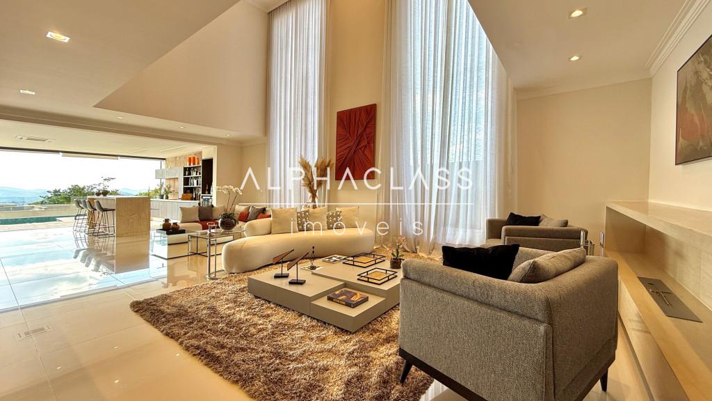 O imóvel possui amplos livings para 3 ambientes com pé direito duplo, lareira e vista privilegiada para a mata, além de mezanino que valoriza ainda mais a integração dos espaços.