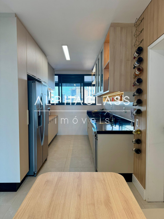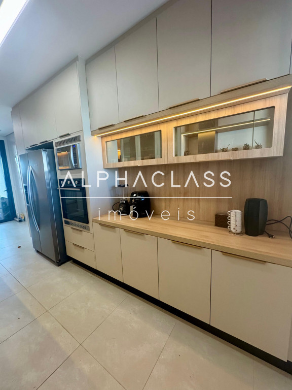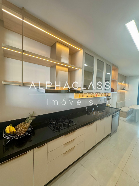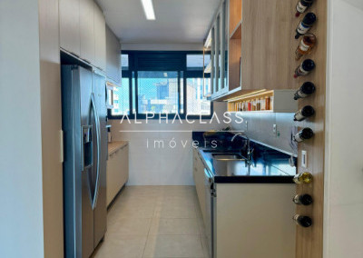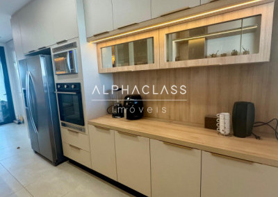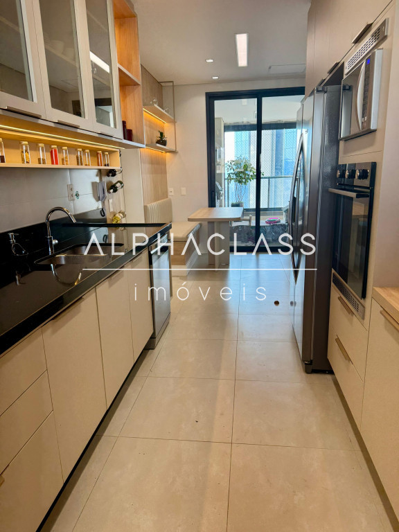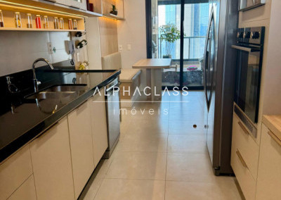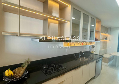 A cozinha é moderna, funcional e totalmente mobiliada, integrada à área de serviço.