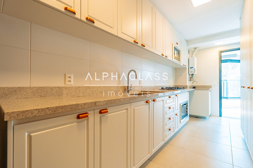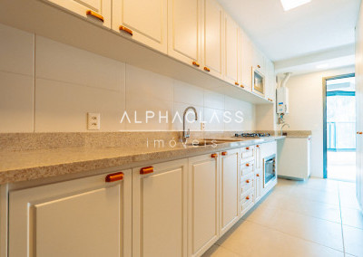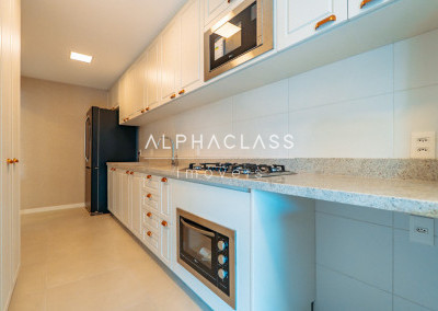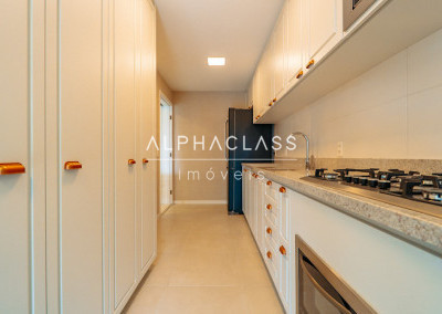 A cozinha é moderna e funcional, integrada à área de serviço equipada.