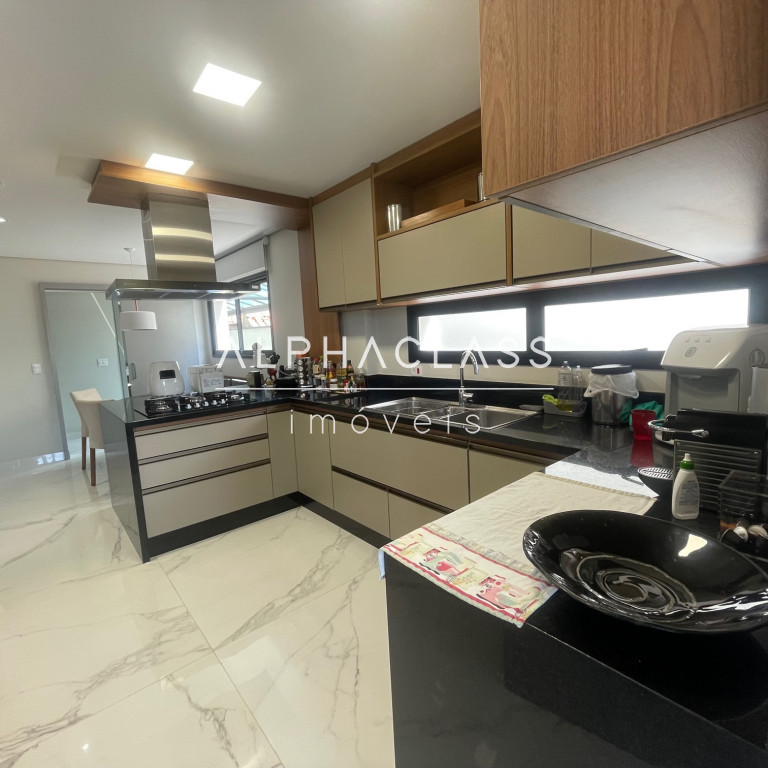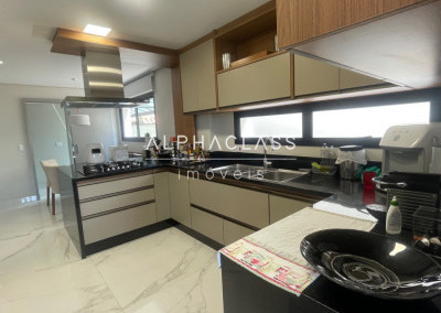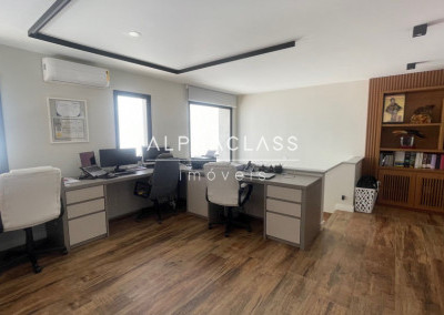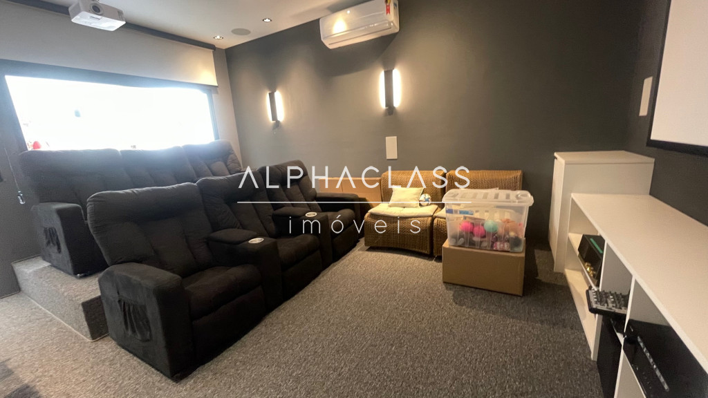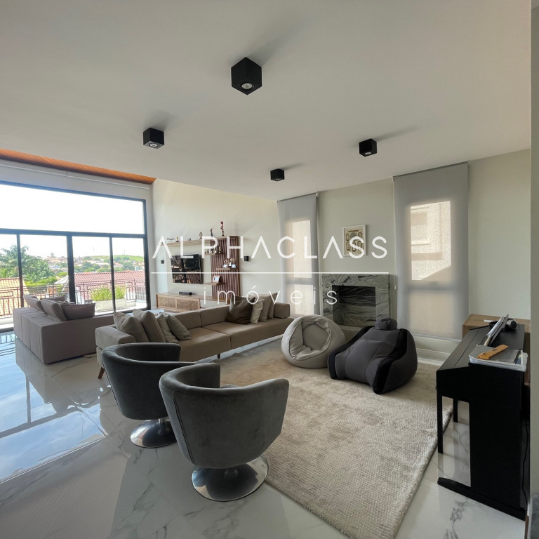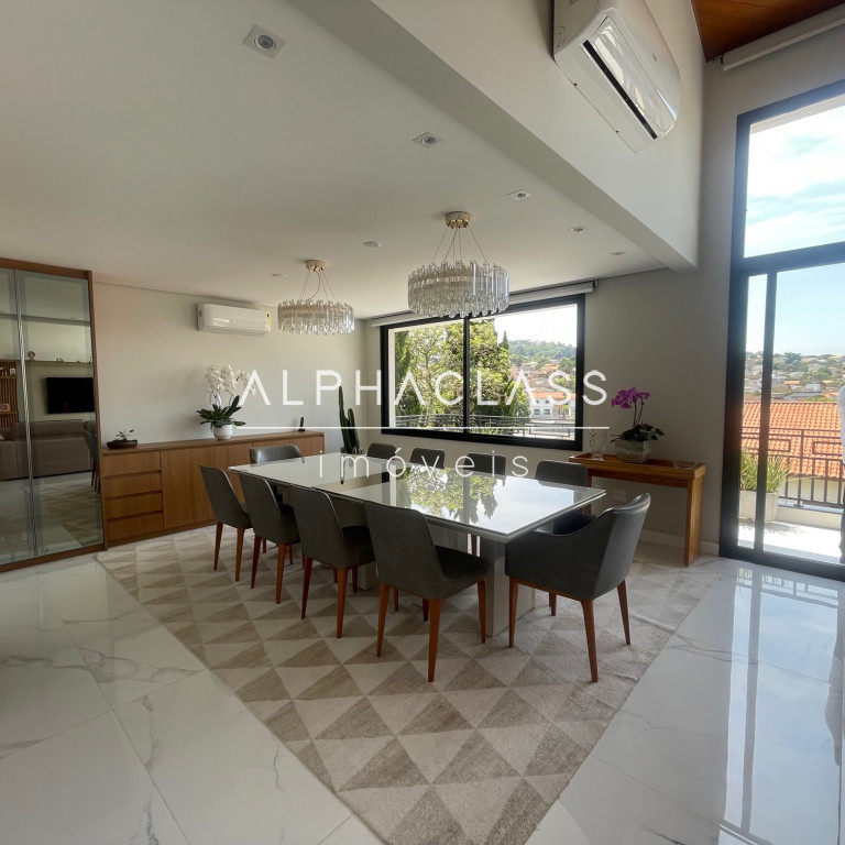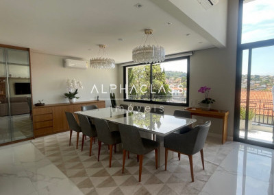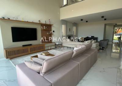 Dispõe de 3 livings integrados para estar, jantar e TV, além de 5 suítes, sendo uma no térreo. Os ambientes são amplos, bem iluminados e mobiliados com bom gosto.