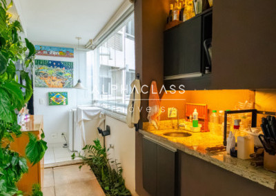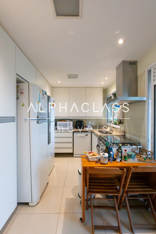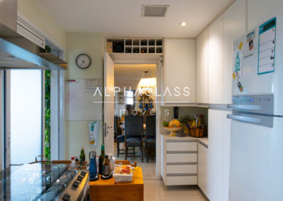 O apartamento conta com elevador privativo com acesso direto ao interior da unidade, além de elevador de serviço. A cozinha é ampla e funcional, com despensa, lavanderia independente e banheiro completo de apoio. Possui ainda depósito externo no próprio andar e 3 vagas de garagem.