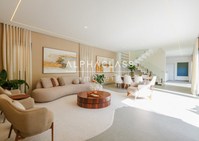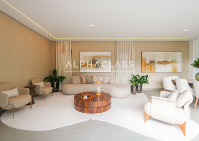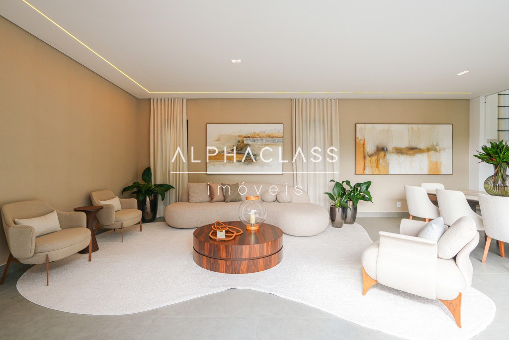 A área social conta com living para três ambientes, integrando sala de estar, sala de jantar e sala de TV, proporcionando conforto e sofisticação para receber familiares e convidados. A cozinha é funcional e bem planejada, harmonizando com os demais ambientes da casa.