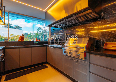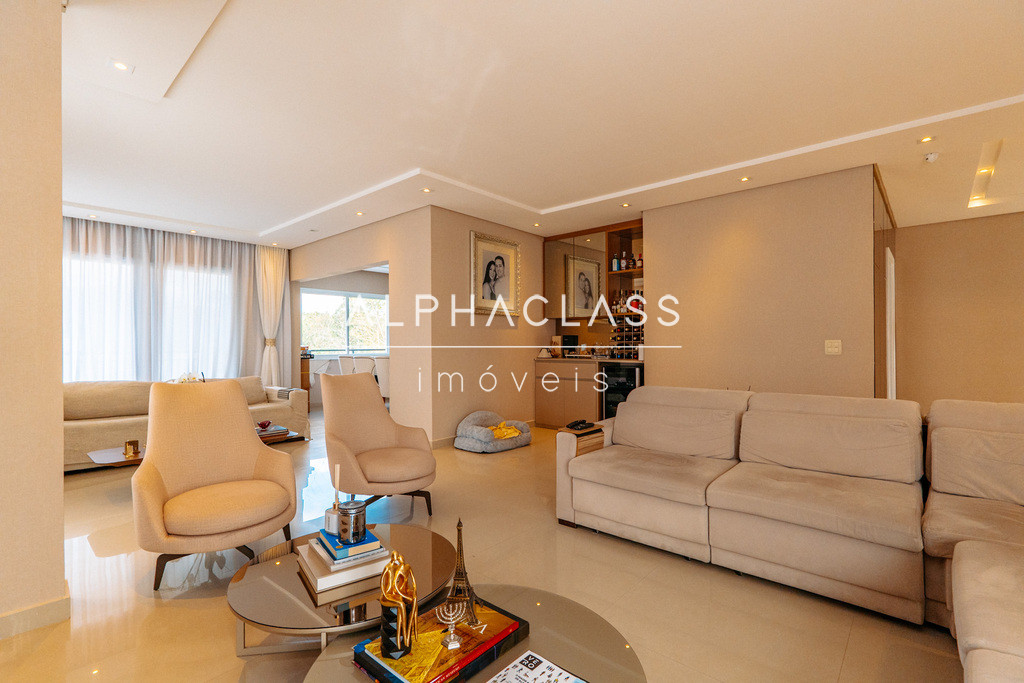 A área social conta com living para três ambientes, integrando sala de estar, sala de jantar e sala de TV, proporcionando conforto e sofisticação para o convívio familiar e para receber convidados.