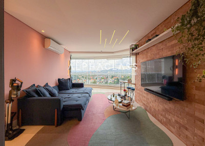 A área social conta com living para três ambientes, integrando sala de estar, sala de jantar e sala de TV, criando um espaço elegante e acolhedor para convivência e recepção de convidados.