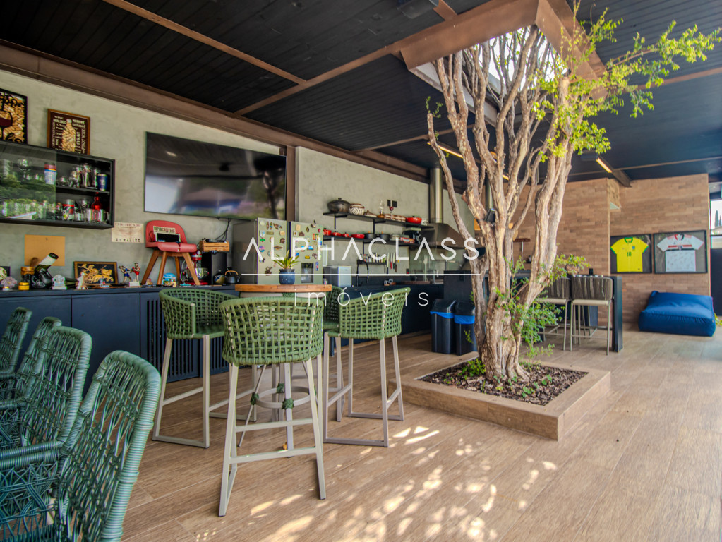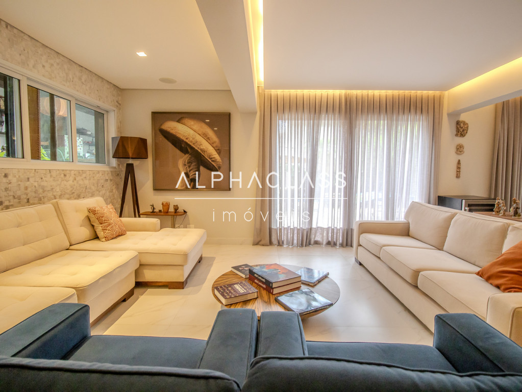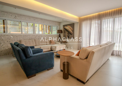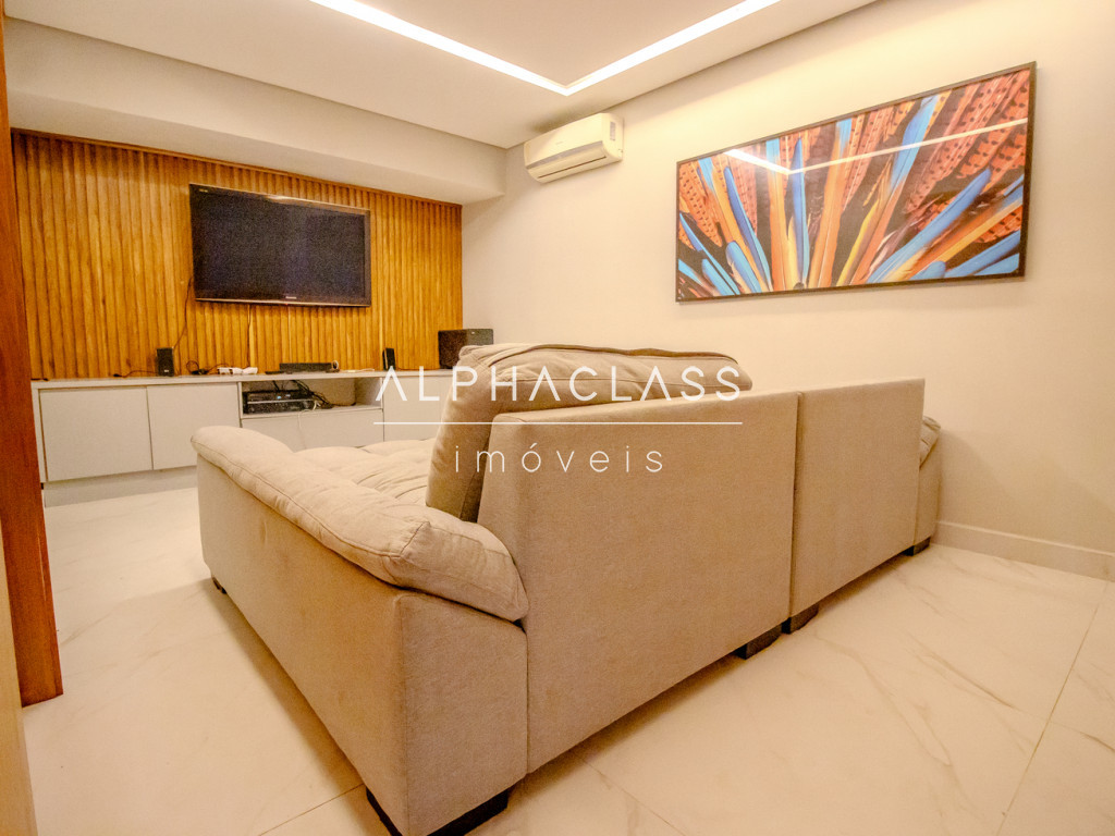 A área social conta com living para três ambientes, integrando sala de estar, sala de jantar e sala de TV, criando um espaço elegante e acolhedor para convivência e recepção de convidados.