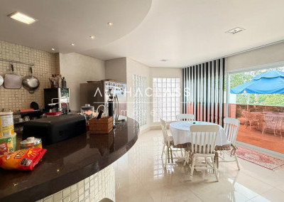 A área de lazer é completa, com espaço gourmet integrado, salão e piscina, ideal para momentos de lazer e recepção de convidados.